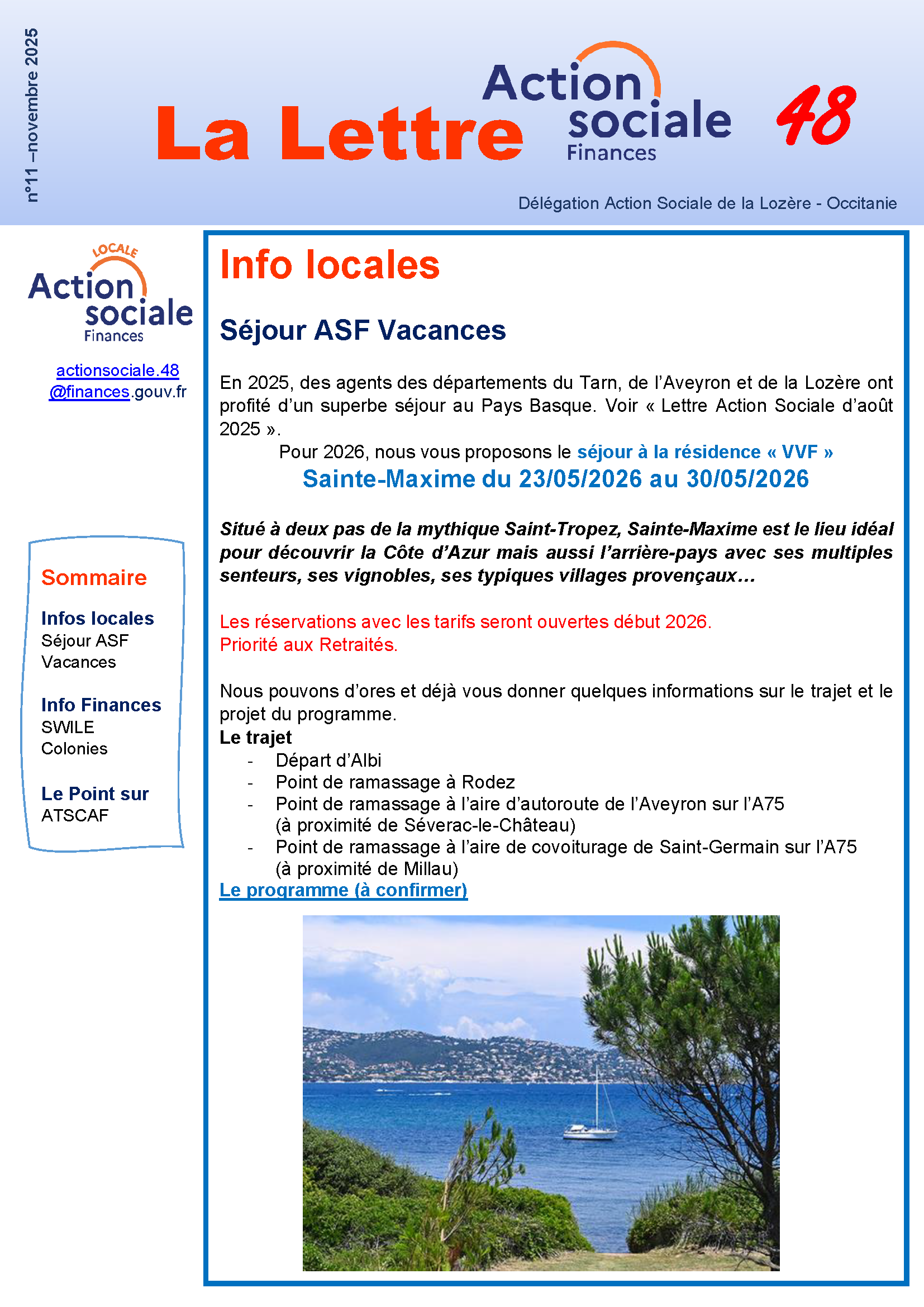La Lettre Action Sociale 48 n° 11 de novembre 2025 au sommaire séjour à Sainte Maxime, carte cadeaux Swile, résultats enquête sur l’ATSCAF.