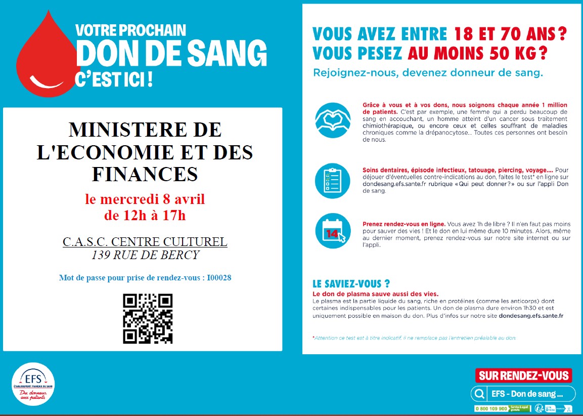 La prochaine collecte de sang aura lieu le MARDI 14 AVRIL 2026 de 9h30 à 14h au CASC 139 rue de Bercy 75012 PARIS