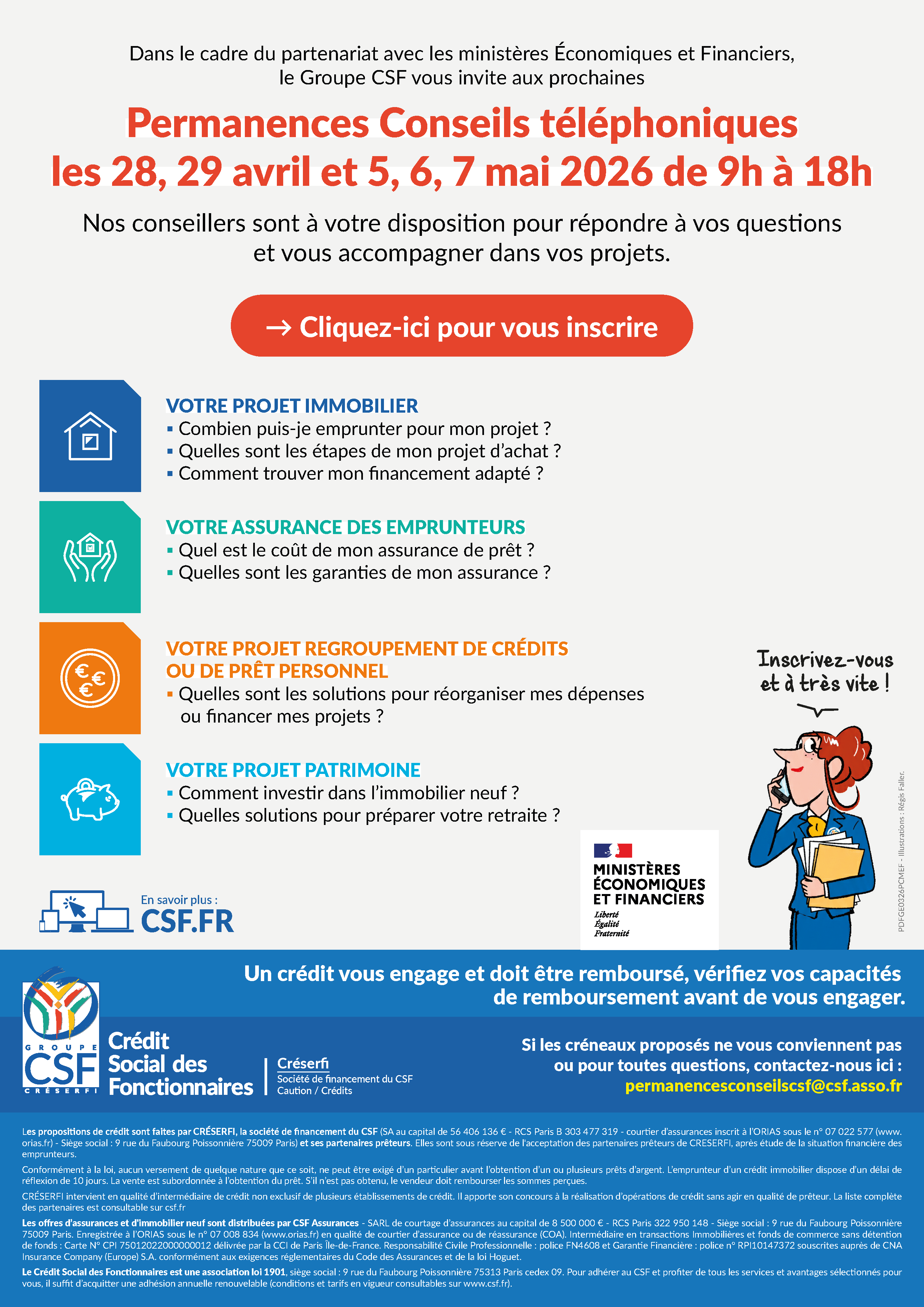 Permanences Conseils téléphoniques les 28, 29 avril et 5, 6, 7 mai 2026 de 9h00 à 18h00.