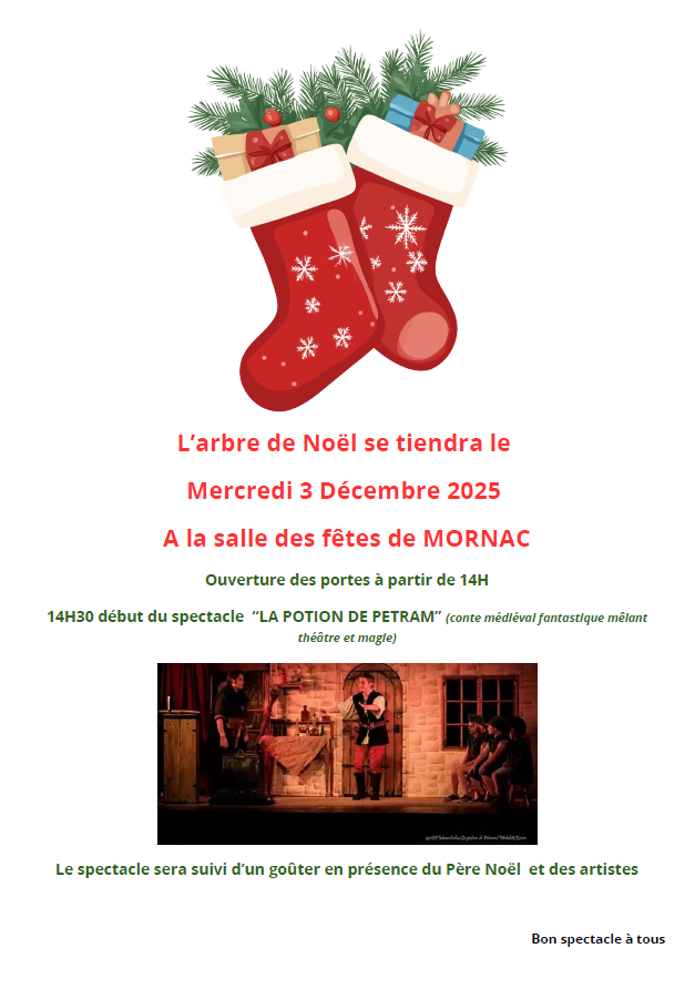 - 3 décembre l’arbre de Noel ; spectacle à la salle des fêtes de Mornac.