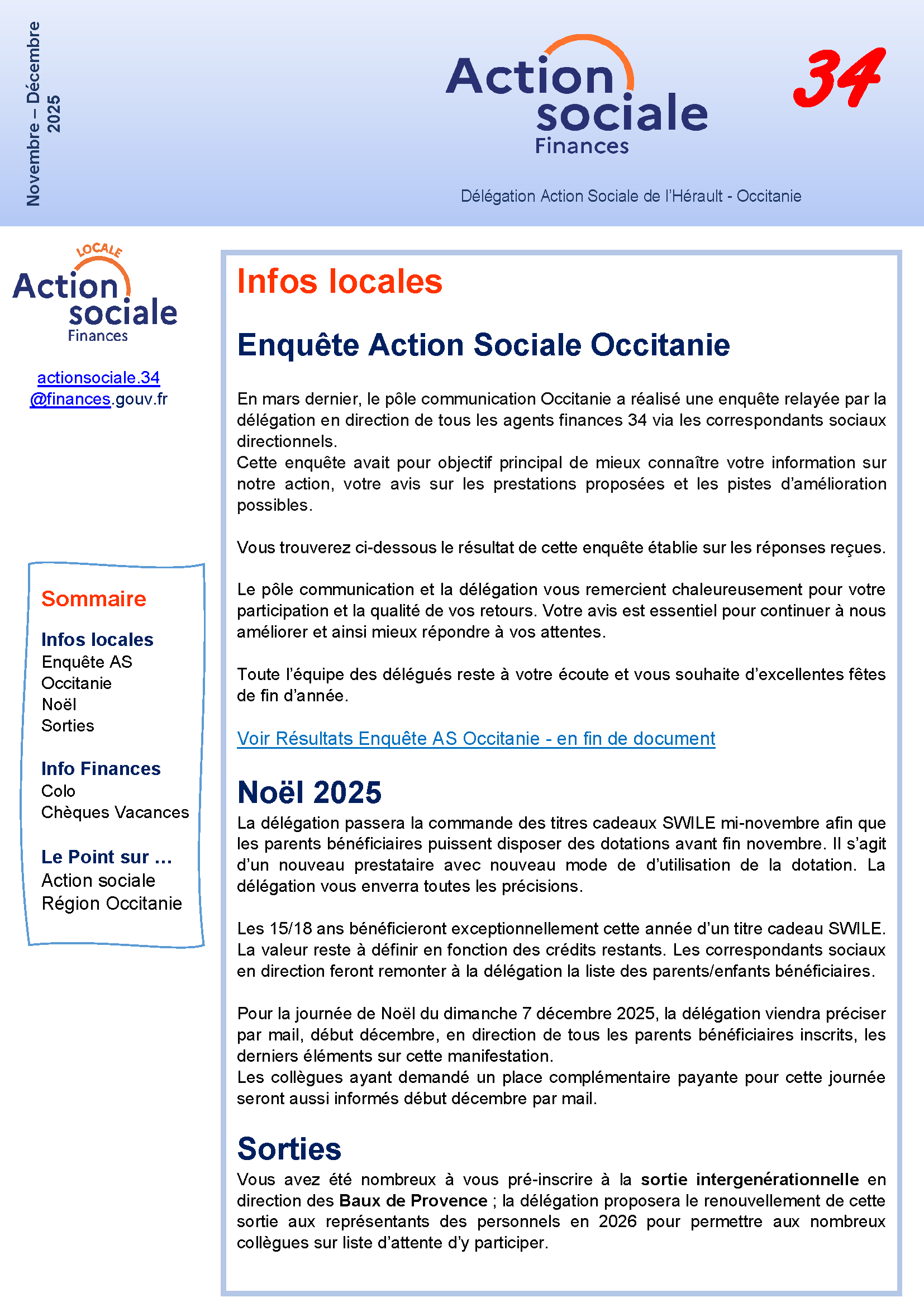 En application de la RGPD, le bureau des pensions n’est plus en droit de transmettre aux délégations départementales d’action sociale le fichier d’adresses des pensionnés. Vous allez bientôt faire valoir vos droits à la retraite, avec comme résidence principale l’Hérault, et vous souhaitez garder le contact avec l’action sociale finances 34. Pour pouvoir bénéficier notamment des actions locales (prestations juridiques, sorties collectives à la journée, séjour groupe ASF Vacances, actions de prévention et d’information…), merci de vous faire connaître auprès de la DDAS34 par l’envoi d’un simple mail à actionsociale.34@finances.gouv.fr tout en précisant vos coordonnées. Si votre future résidence principale se situe dans un autre département, et si vous souhaitez rester informé(e) des actions locales, vous pouvez demander votre demande de rattachement à la délégation concernée par mail à « actionsociale.XX@finances.gouv.fr » (remplacer XX par le numéro de votre département) avec copie à actionsociale.34@finances.gouv.fr