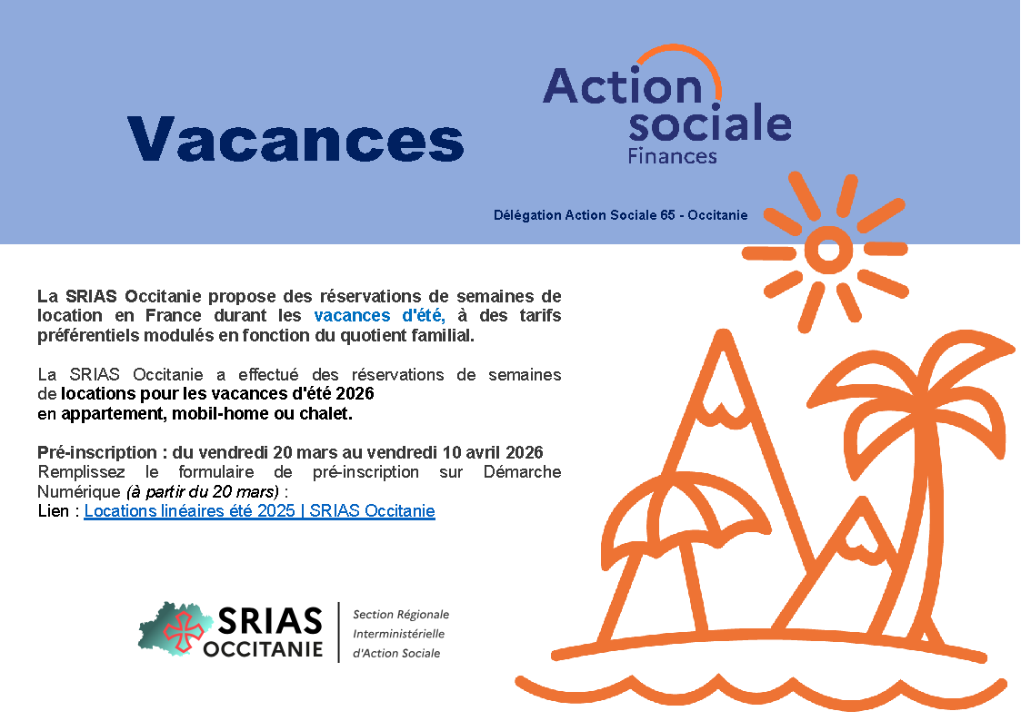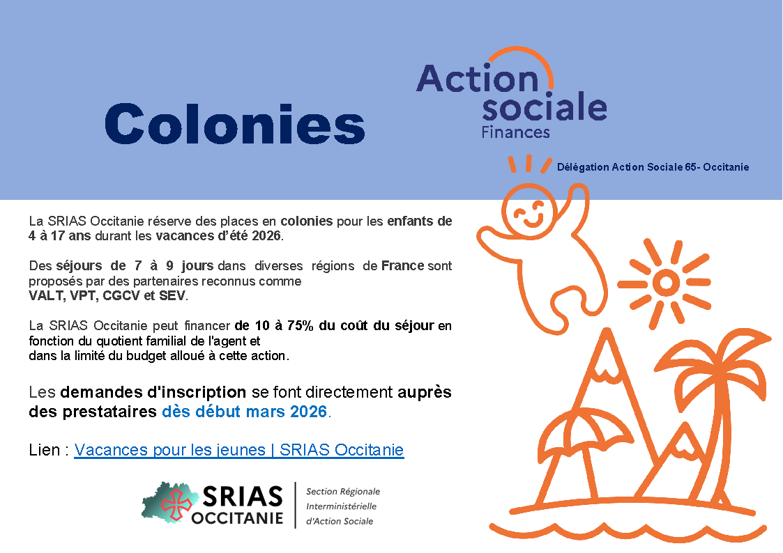 Des berceaux sont réservés au niveau interministériel par la SRIAS Occitanie (Section régionale interministérielle de l’action sociale).Vos demandes sont à adresser à la SRIAS OCCITANIE et à votre référent ministériel :