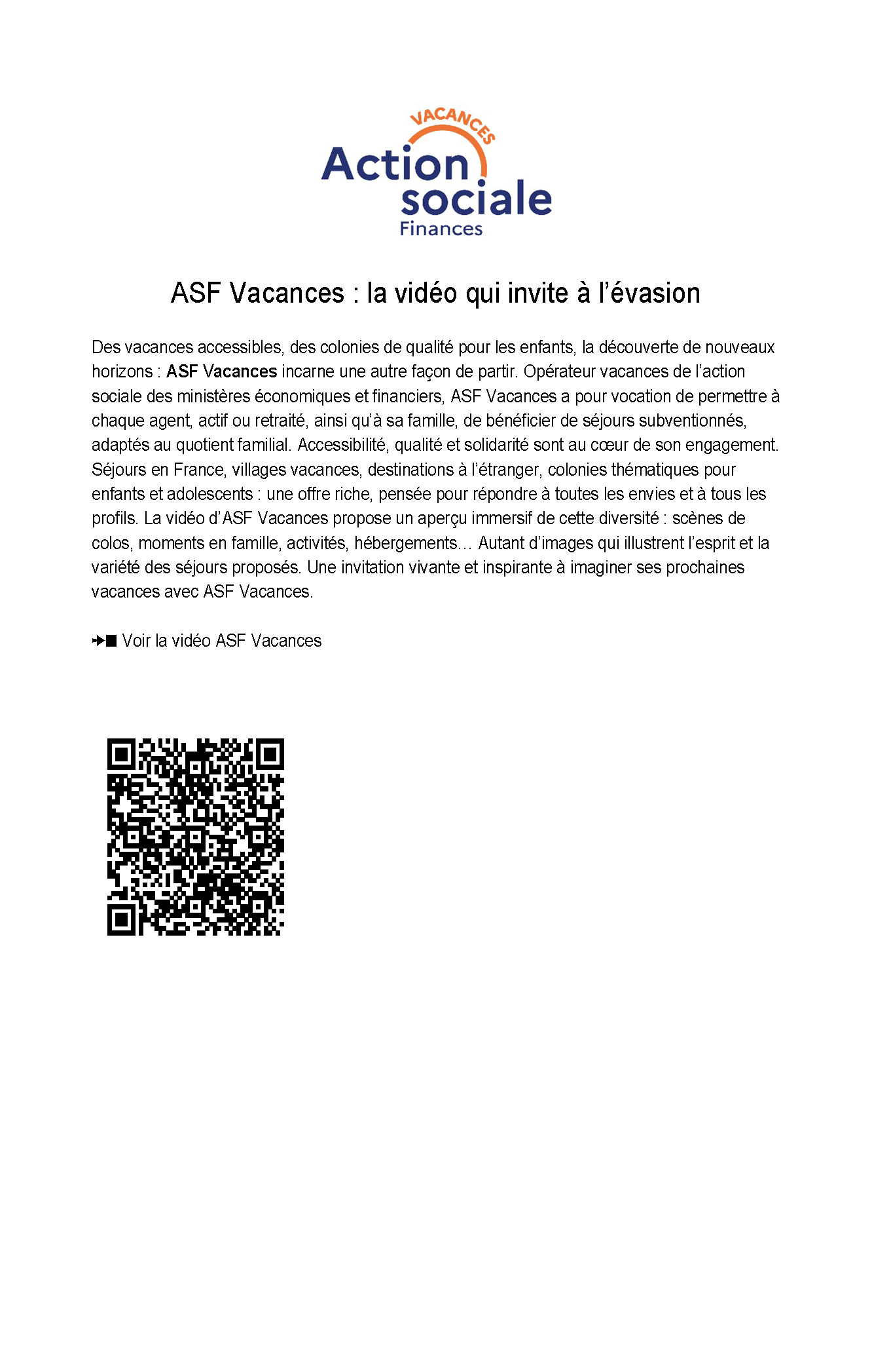 L’ASF Vacances est une association loi 1901, sous convention avec les ministères économiques et financiers. Elle propose des prestations de vacances et de loisirs pour tous les agents et retraités, tout au long de l’année : séjours longs, séjours à thème, séjours de groupe. Pendant les vacances scolaires (sauf celles de la Toussaint), ASF Vaances propose des colonies de vacances pour les enfants mineurs des agents de ministères financiers.